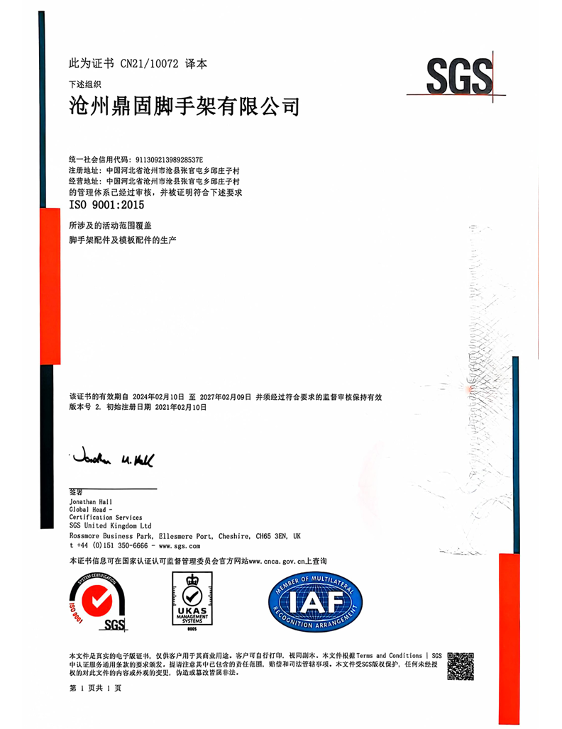 鼎固集团始建于1996年 集研发、生产、销售与服务于一体的综合性工贸企业。 集团旗下拥有沧州市金帝五金制品有限公司、沧州鼎固脚手架有限公司、沧州鼎固进出口贸易有限公司三大核心公司,并设有多个现代化生产基地。